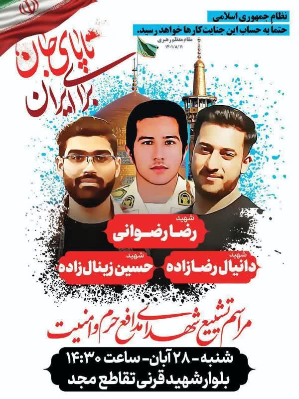مراسم تا پای جان برای ایران، برای تشییع شهدای حرم و امنیت با حضور باشکوه مردم انقلابی و وطن دوست به تاریخ شنبه 28 آبان 1401 در چهار راه مجد برگزار می شود.