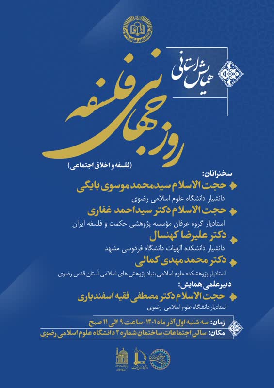 به مناسبت روز جهانی فلسفه، همایش استانی با موضوع فلسفه و اخلاق اجتماعی به تاریخ سه شنبه یکم اذرماه 1401 در سالن اجتماعات شماره دو دانشگاه علوم اسلامی رضوی برگزار می شود.