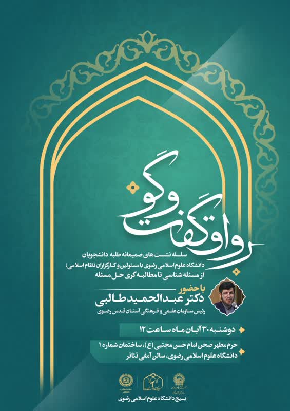 دکتر عبدالحمید طالبی، رییس سازمان علمی فرهنگی آستان قدس رضوی در این هفته دوشنه 30 آبان 1401 در ساختمان شماره یک دانشگاه علوم اسلامی رضوی مهمان طلاب و دانشجویان است تا پاسخگوی پرسش های آنان باشد.