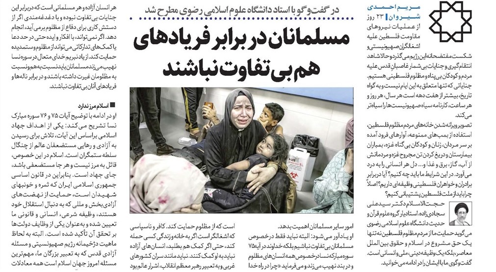 استادیار گروه علوم قرآنی و حدیث دانشگاه علوم اسلامی رضوی عنوان میکند: وظیفه هر مسلمانی است که از مظلوم حمایت کند. کافر و ناسپاسی که اشغالگر است اگر به خانه و زندگی کسی حمله کند، حتی اگر کمک هم بطلبد، انسانهای آزاده نباید به او کمک کنند. نباید مانند سران کشورهای غربی و به تعبیر رهبر معظم انقلاب، اشرار عالم بود و از ظالم حمایت کرد. نباید از کافر حمایت کرد اما فردی که مؤمن نیست ولی کفر صهیونیستها را ندارد، او مستضعف است و به فرموده ائمه(ع) اگر مستضعفان و زن و کودک مسلمان مورد آزار قرار گرفتند باید کمک کرد. حتی اگر زن و بچه یک غیرمسلمان بهطور نمونه حتی فردی مسیحی هم مورد ظلم قرار گرفت نیاز به حمایت دارد. همچنان که پیش از حضور صهیونیستها در فلسطین، مسلمانها و یهودیهای کنونی فسلطین و مسیحیان در کنار هم زندگی مسالمتآمیزی داشتند اما با آمدن اشغالگران صهیونیست و تفکر افراطی یهودیگری، سرزمین فلسطین را اشغال کردند، حدود ۷۵سال مردم زیادی را از موطن خود آواره کرده و آنهایی که با مقاومت زیاد در کرانه باختری و باریکه غزه مقاومت کرده و ماندند، در طول سالها بارها و بارها هدف جنایات سفاکانه رژیم اشغالگر قرار گرفتند.