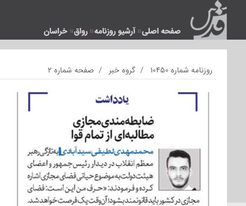 به گزارش روابط عمومی دانشگاه رضوی، محمد مهدی لطیفی سیدآبادی، طلبه و دانشجوی ارشد حقوق خصوصی دانشگاه رضوی پیرامون نخستین دیدار رهبر معظم انقلاب با هیئت دولت و اشاره ایشان به حکمرانی قانون در فضای مجازی در یادداشتی برای روزنامه قدس انتشار دهم شهریور 1403 به تبیین حکمرانی قانونمند و ضابطه مندی آن پرداخت.
