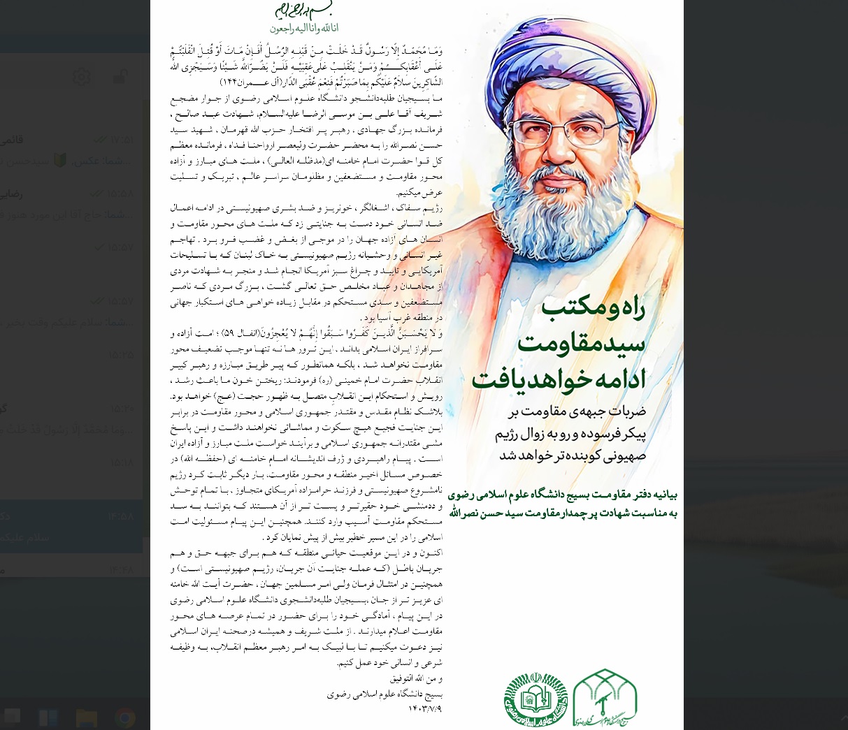 ما بسیجیان طلبهدانشجو دانشگاه علوم اسلامی رضوی از جوار مضجع شریف آقا علی بن موسی الرضا علیهالسلام، شهادت عبد صالح ، فرماند بزرگ جهادی ، رهبر پر افتخار حزب الله قهرمان ، شهید سید حسن نصرالله را به محضر حضرت ولیعصر ارواحنا فداه ، فرمانده معظم کل قوا حضرت امام خامنه ای(مدظله العالی) ، ملت های مبارز و آزاده محور مقاومت و مستضعفین و مظلومان سراسر عالم ، تبریک و تسلیت عرض میکنیم.