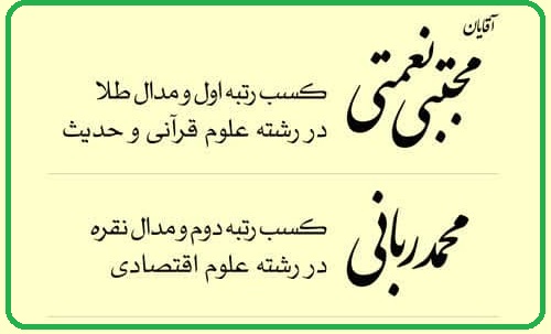 آقایان مجتبی نعمتی با کسب مدال طلا رتبه یک رشته علوم قرآنی و حدیث کشور و محمد ربانی با دریافت مدال نقره رتبه دوم علوم اقتصادی را در این المپیاد علمی به خود اختصاص داند.