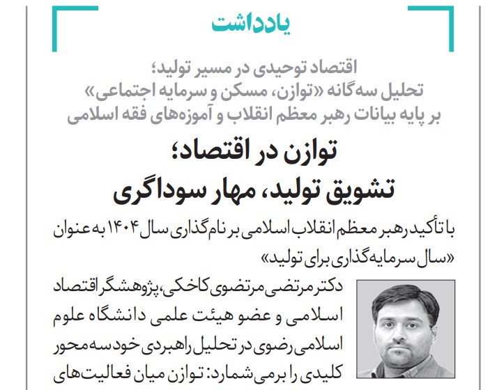 به گزارش روابط عمومی دانشگاه علوم اسلامی رضوی، دکتر مرتضی مرتضوی کاخکی، عضو هیئت علمی دانشگاه رضوی در یادداشتی برای روزنامه قدس به موضوع عنوان سال و مسئله سرمایه گذاری و تولید پرداخت و ضمن توجه به اقتصاد توحیدی در مسیر تولید؛ به تحلیل سهگانه «توازن، مسکن و سرمایه اجتماعی» بر پایه بیانات رهبر معظم انقلاب به عنوان سه محور کلیدی اشاره داشته و آموزههای فقه اسلامی نیز سخن می گوید.