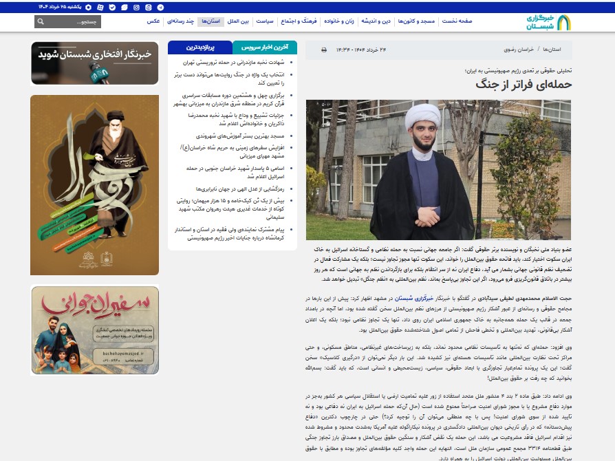 به گزارش روابط عمومی دانشگاه علوم اسلامی رضوی، حجت الاسلام محمدمهدی لطیفی سیدآبادی، دانشجوی ارشد دانشگاه رضوی در گفت و گو با خبرگزاری شبستان به مسئله جنایات اسرائیل و حمله به ایران از دیدگاه حقوقی پرداخت که متن آن از قرار زیر است: