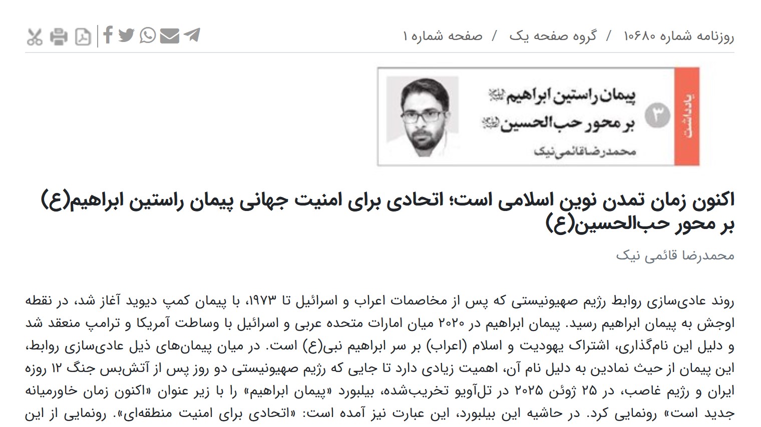 روند عادیسازی روابط رژیم صهیونیستی که پس از مخاصمات اعراب و اسرائیل تا ۱۹۷۳، با پیمان کمپ دیوید آغاز شد، در نقطه اوجش به پیمان ابراهیم رسید. پیمان ابراهیم در ۲۰۲۰ میان امارات متحده عربی و اسرائیل با وساطت آمریکا و ترامپ منعقد شد و دلیل این نامگذاری، اشتراک یهودیت و اسلام (اعراب) بر سر ابراهیم نبی(ع) است. در میان پیمانهای ذیل عادیسازی روابط، این پیمان از حیث نمادین به دلیل نام آن، اهمیت زیادی دارد تا جایی که رژیم صهیونیستی دو روز پس از آتشبس جنگ ۱۲ روزه ایران و رژیم غاصب، در ۲۵ ژوئن ۲۰۲۵ در تلآویو تخریبشده، بیلبورد «پیمان ابراهیم» را با زیر عنوان «اکنون زمان خاورمیانه جدید است» رونمایی کرد. در حاشیه این بیلبورد، این عبارت نیز آمده است: «اتحادی برای امنیت منطقهای». رونمایی از این بیلبورد، آن هم روی خرابههای تلآویو ناشی از موشکهای ایرانی، بیش از هر چیز بیانگر آن است که موضوع اصلی تمام مسائل منطقه در نیم قرن اخیر، تقابل دو ایده عادیسازی روابط و ایده مقاومت است و عادیسازی روابط، اکنون با ابراهیم نبی(ع) نیز گره خورده است.