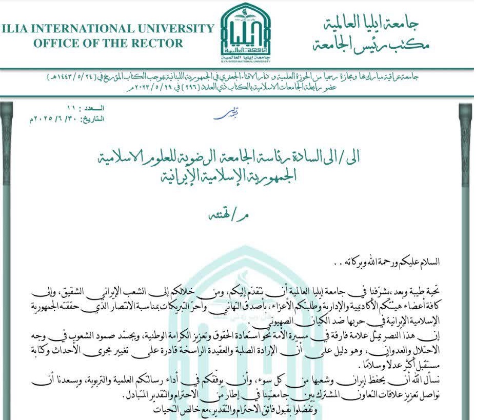 با احترام و پس از عرض تحیت، به نمایندگی از دانشگاه ایلیا، به شما و از طریق شما به ملت برادر ایران، اعضای هیئت علمی، کارکنان اداری و دانشجویان گرامی، صمیمانهترین تبریکات را به مناسبت پیروزی جمهوری اسلامی ایران در نبرد خود علیه رژیم صهیونیستی تقدیم میکنیم.