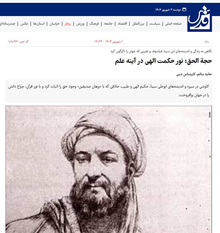 به گزارش روابط عمومی دانشگاه علوم اسلامی رضوی، خانم سالم ارشد فلسفه و کلام پردیس خواهران دانشگاه علوم اسلامی رضوی در یادداشتی برای سرویس آنلاین روزنامه قدس، نگاهی به زندگی و اندیشههای ابن سینا، فیلسوف و طبیبی که جهان را دگرگون کرد، داشته و با عنوان حجة الحق؛ نور حکمت الهی در آینه علم، کاوشی در سیره و اندیشههای ابوعلی سینا، حکیم الهی و طبیب حاذقی که با «برهان صدیقین» وجود حق را اثبات کرد و با نور قرآن، چراغ دانش را در جهان برافروخت، انجام داد.