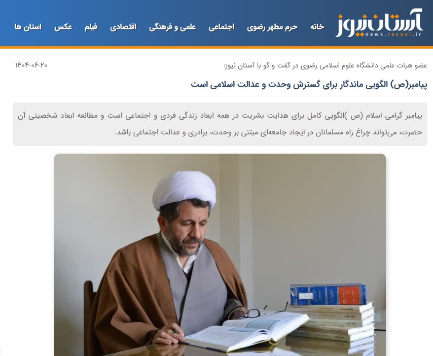 به گزارش روابط عمومی دانشگاه علوم اسلامی رضوی، حجت الاسلام والمسلمین دکترمحمد امامی، عضو هیئت علمی دانشگاه رضوی، در گفت و گویی با آستان نیوز، رسانه رسمی آستان قدس رضوی پیرامون وحدت و شخصیت پیامبر گرامی اسلام به عنوان الگویی ماندگار سخن گفت.