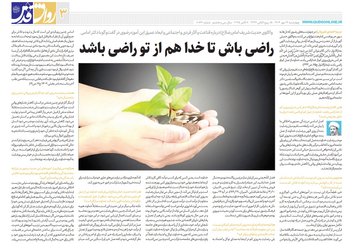 به گزارش روابط عمومی دانشگاه علوم اسلامی رضوی، در چهارشنبههای رضوی که دلها به سوی حریم قدسی امام هشتم(ع) پر میکشد، حجت الاسلام والمسلمین دکتر امامی، عضو هیئت علمی دانشگاه رضوی در روزنامه قدس به واکاوی حدیثی گهربار از آن حضرت پرداخت که آرامش روانی و رضایت الهی را در گرو رضایت به روزی کم میداند.