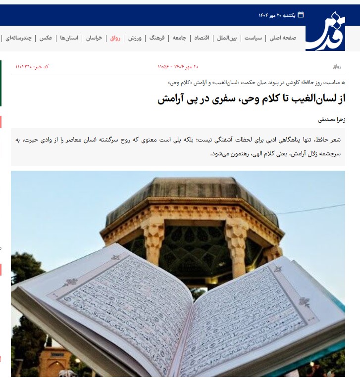 به گزارش روابط عمومی دانشگاه علوم اسلامی رضوی، خانم تصدیقی دانشجوی ارشد پردیس خواهران دانشگاه رضوی به مناسبت روز حافظ؛ کاوشی در پیوند میان حکمت «لسانالغیب» و آرامش «کلام وحی» با عنوان از لسانالغیب تا کلام وحی، سفری در پی آرامش، برای سرویس آنلاین روزنامه قدس به رشته تحریر درآورده تا به نوعی پاسخی باشد برای کسامی که ندانسته و نشناخته حافظ را که هویت و نامش برگرفته از حفظ آیات قرآن است علمی برای دشمنی با دین و نظام و قرآن برافراشته اند.