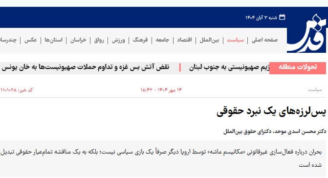 به گزارش روابط عمومی دانشگاه علوم اسلامی رضوی، محسن اسدی موحد، دانشجوی دکترای حقوق بین الملل و مبلغ بین المللی دانشگاه رضوی در یادداشتی برای سرویس آنلاین روزنامه قدس به بحران فعالسازی غیر قانونی مکانیسم ماشه پرداخت و از بُعد حقوقی مورد بررسی قرار داد.