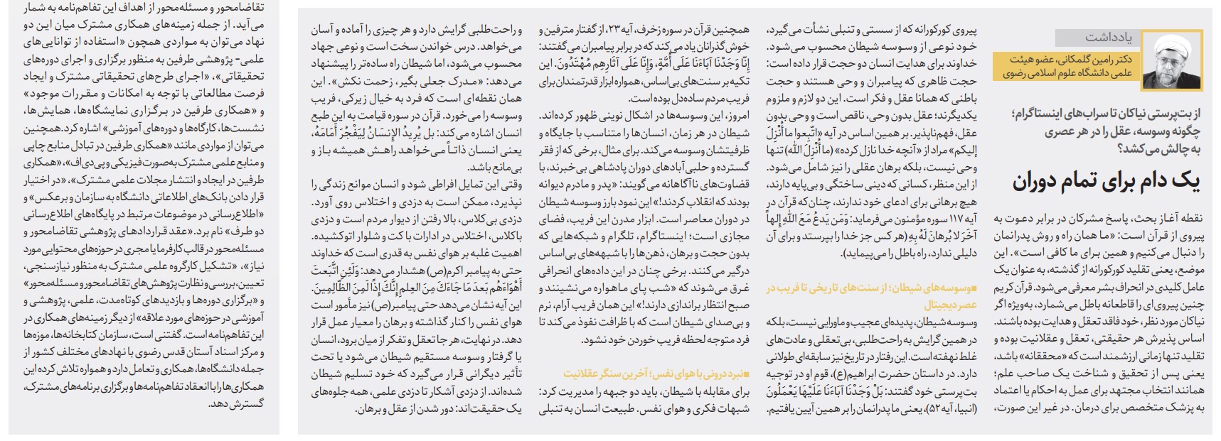 به گزارش روابط عمومی دانشگاه علوم اسلامی رضوی، حجت الاسلام والمسلمین دکتر رامین گلمکانی، عضو هیئت علمی دانشگاه رضوی در یادداشتی برای روزنامه قدس از بتپرستی نیاکان تا سرابهای اینستاگرام نوشت و به سوال «چگونه وسوسه، عقل را در هر عصری به چالش میکشد؟» پرداخت.