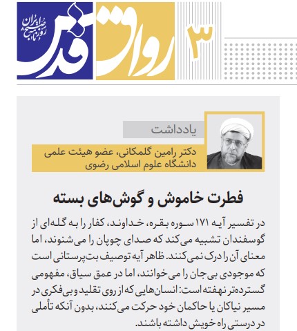 به گزارش روابط عمومی دانشگاه علوم اسلامی رضوی، حجت الاسلام والمسلمین دکتر رامین گلمکانی، عضو هیئت علمی دانشگاه رضوی در یادداشتی برای روزنامه قدس در تفسیر آیه ۱۷۱ سوره بقره از فطرت خاموش و گوشهای بسته نوشت که خداوند کفار را به گلهای از گوسفندان تشبیه میکند که صدای چوپان را میشنوند، اما معنای آن را درک نمیکنند.
