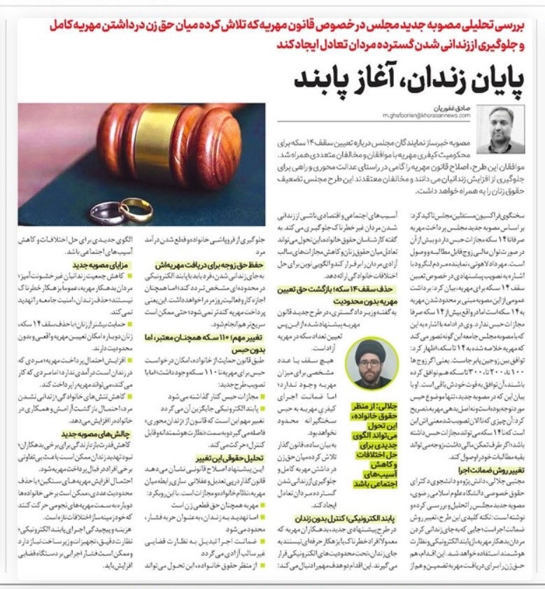 به گزارش روابط عمومی دانشگاه علوم اسلامی رضوی، حجت الاسلام مجتبی جلالی، دانشجوی دکتری حقوق خصوصی دانشگاه رضوی در مطلبی برای روزنامه خراسان به بررسی تحلیلی مصوبه جدید مجلس در خصوص قانون مهریه پرداخته است.