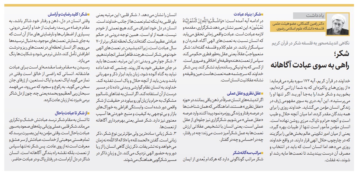 اگر اندیشههای انسان صرفاً در ذهن باقی بمانند در حوزه «عقل نظری» هستند، اما هنگامی که همان شناختها در عرصه رفتار و زندگی روزمره نمود پیدا کنند وارد عرصه «عقل عملی» میشویم. شکرگزاری نیز جلوهای از عقل عملی است، یعنی انسان با تشخیص عقلانی ارزش نعمتها به عمل شکرآمیز دست میزند؛ چه در رفتار، چه در احساس و چه در گفتار.